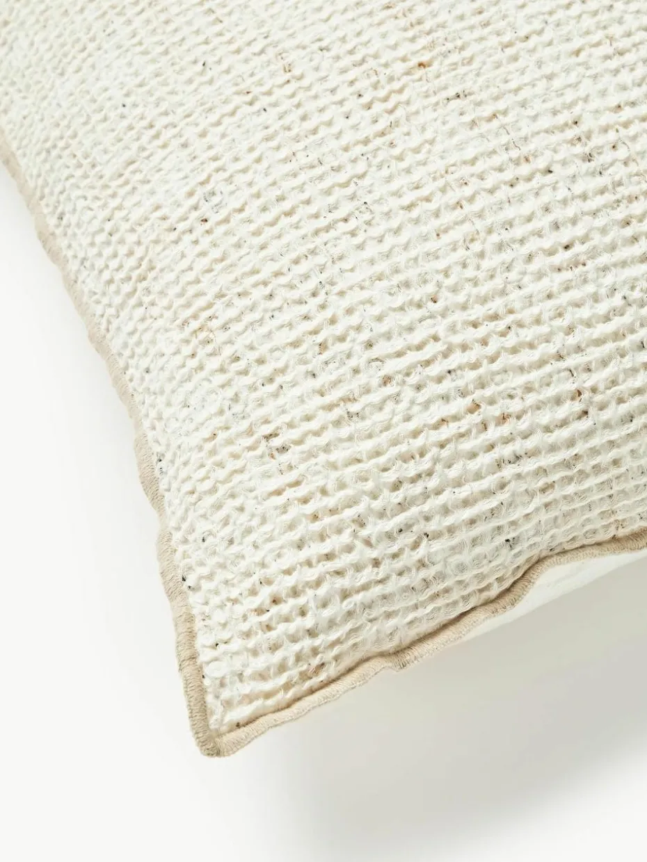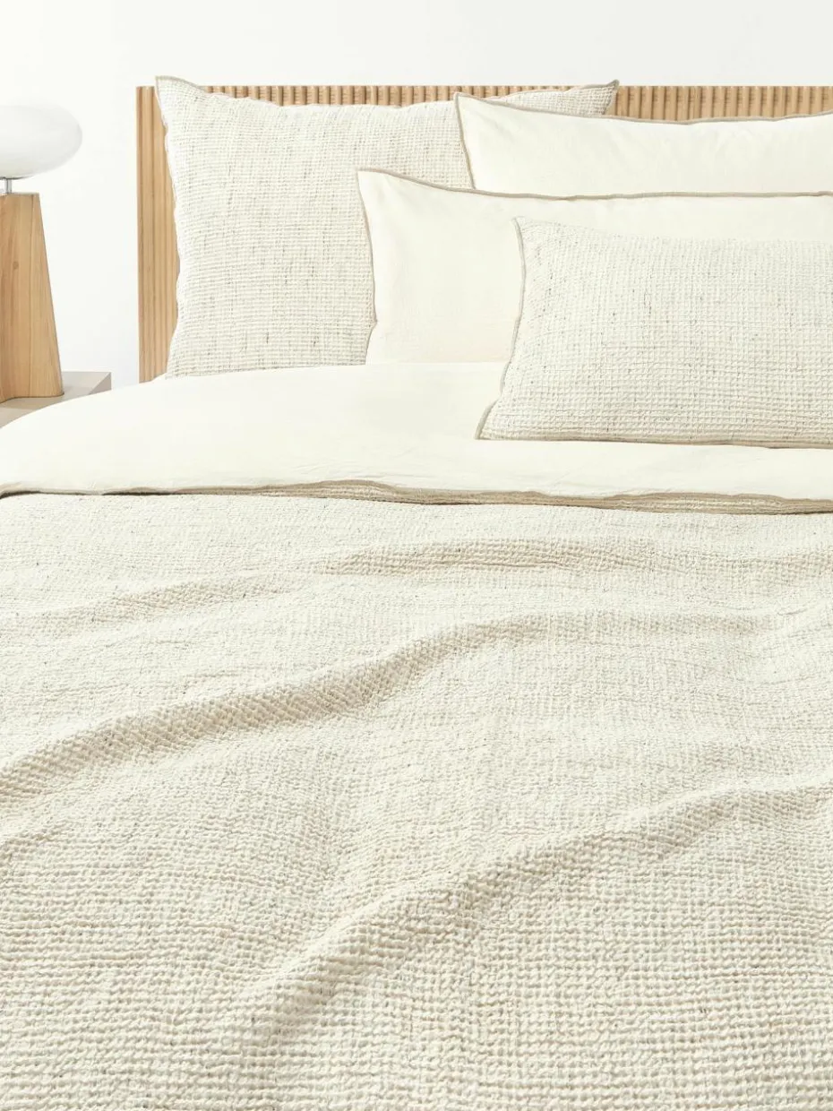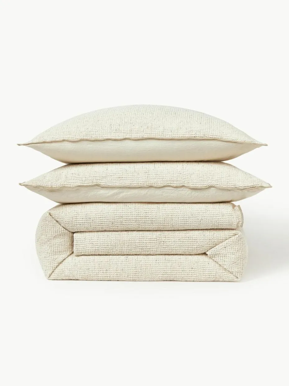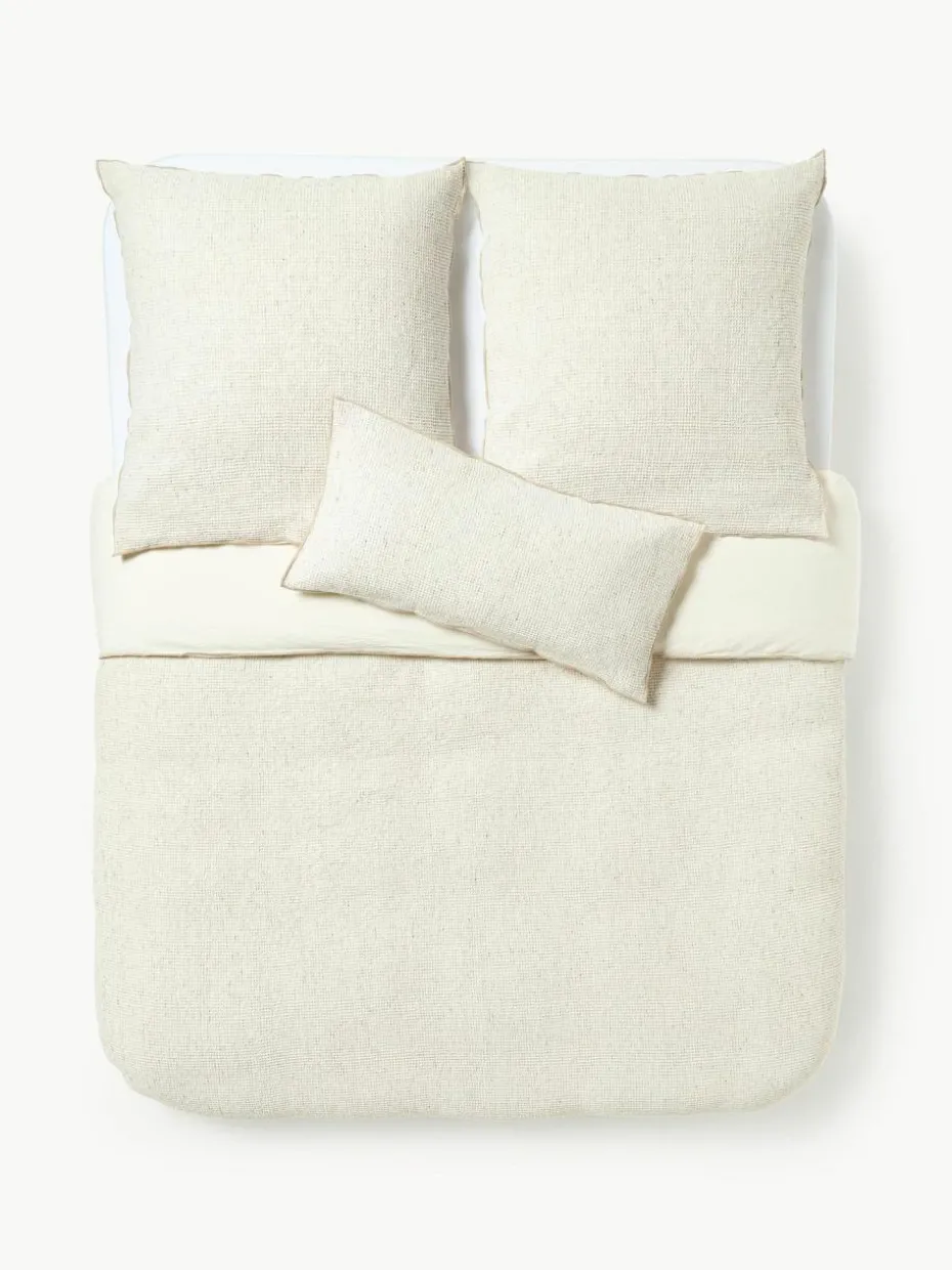 Der Baumwoll-Bettdeckenbezug mit Waffelstruktur auf der Vorderseite und unifarbener Rückseite verfügt über einen Knopfverschluss und wurde in Portugal gefertigt.