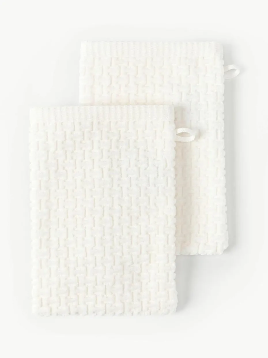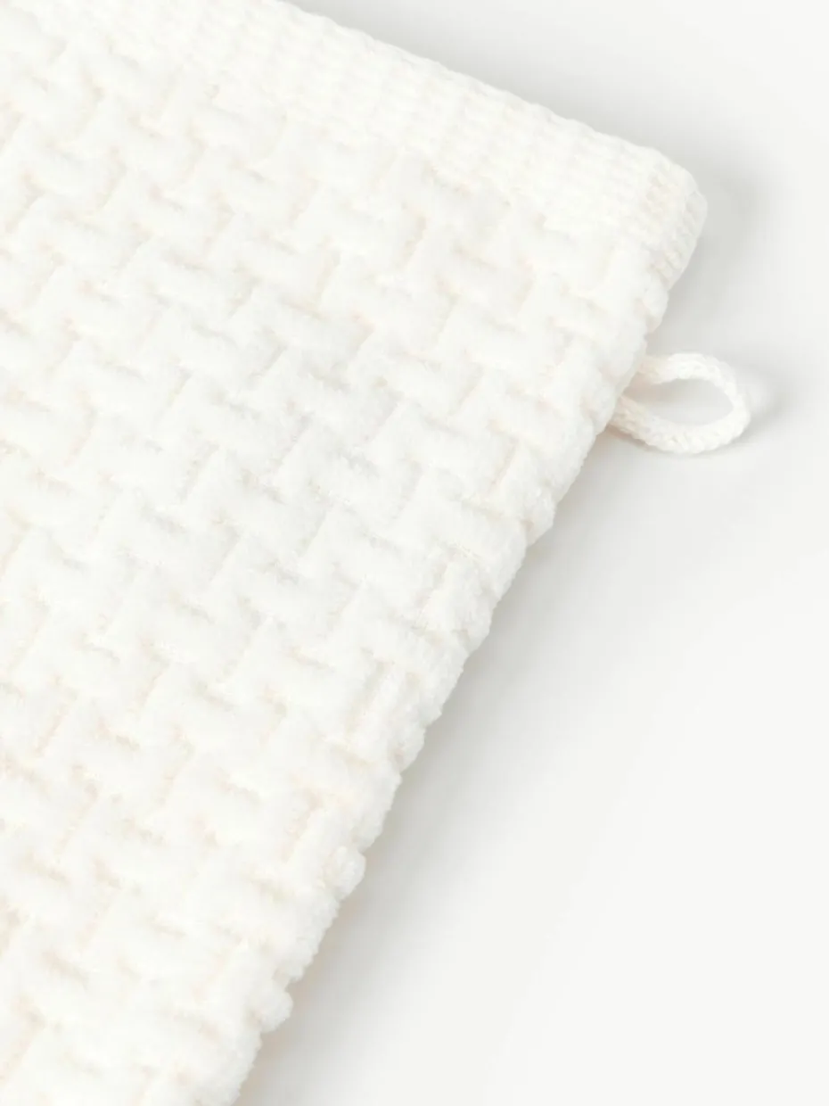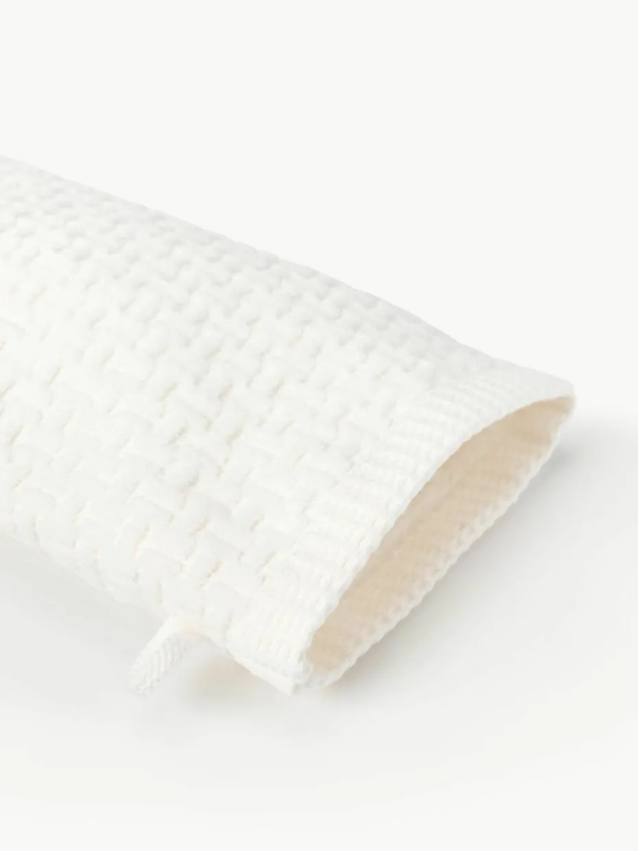 Die Waschhandschuhe verfügen über Aufhängeschlaufen und wurden in Portugal gefertigt.