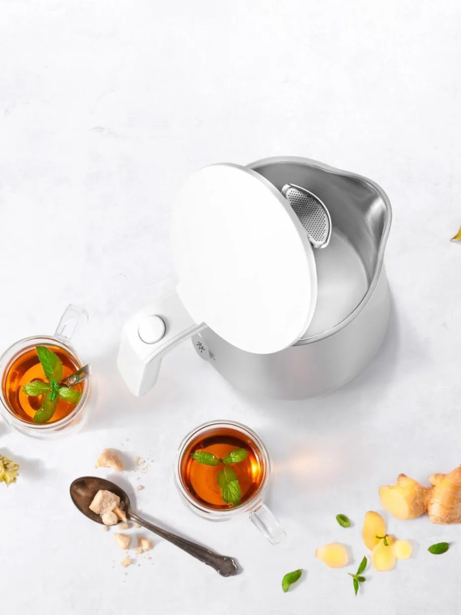 Wasser kann jede Form annehmen, dies ist die schönste: der Wasserkocher Pro im zeitlosen ZWILLING Design. Der moderne Kocher überzeugt aber nicht nur durch sein hochwertiges Design, sondern auch durch zahlreiche Funktionen. Der Wasserkocher mit Temperatureinstellung bietet 7 Programme, die über die 360°-Basisstation mit Sensor-Touch-Display ausgewählt werden können. So erreicht der 1850-Watt-Kocher mit seinem Temperaturregler immer die ideale Gradzahl für beispielsweise Kaffee, Tee oder Babynahrung. Mit der integrierten Warmhaltefunktion bleibt das Wasser bis zu 30 Minuten auf Wunschtemperatur. Auch das wärmeisolierende doppelwandige Gehäuse hält das Wasser im Inneren länger warm und sorgt gleichzeitig für eine kühle Außenwand.