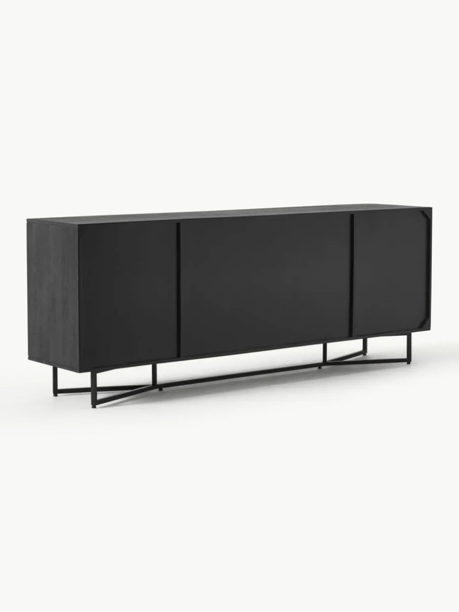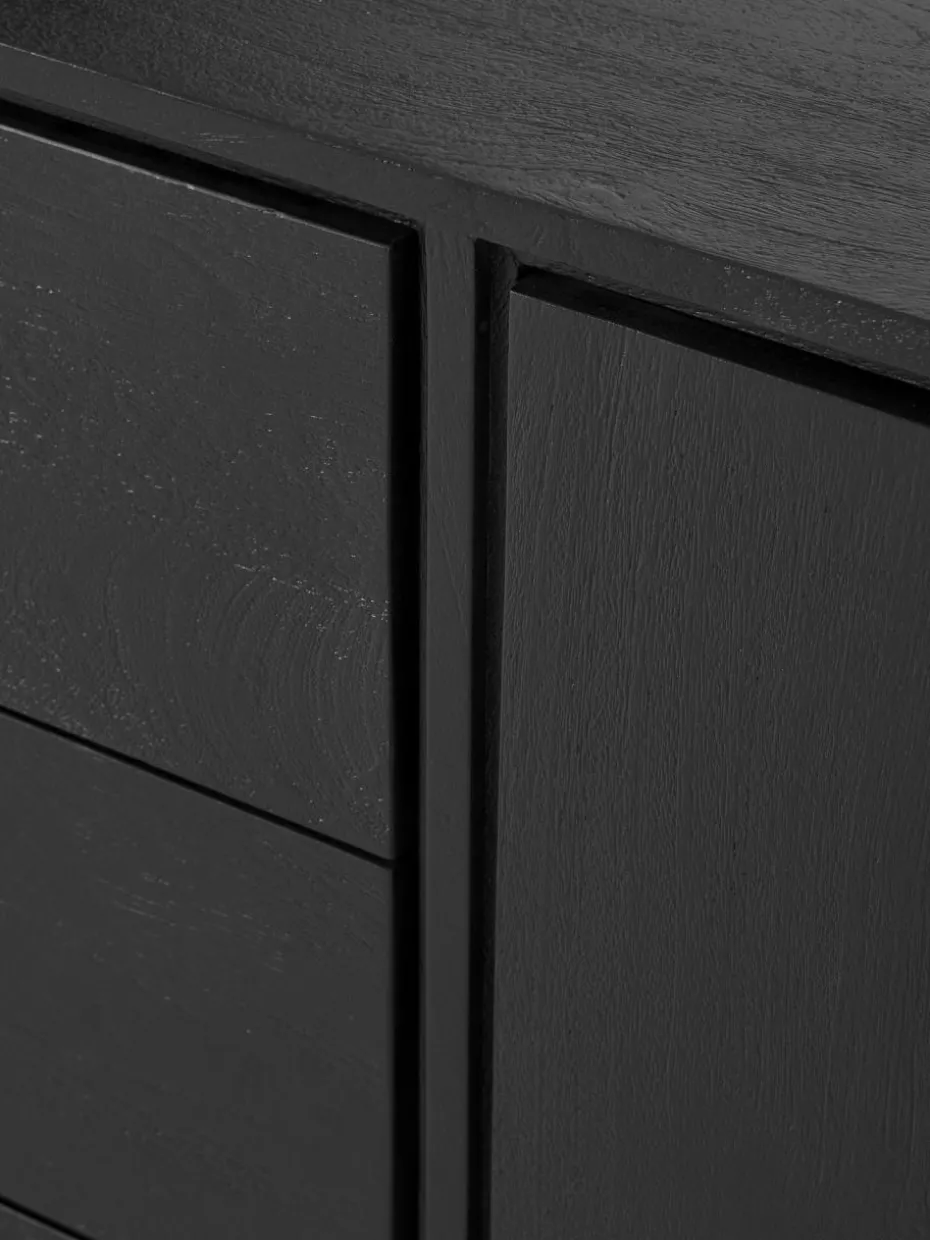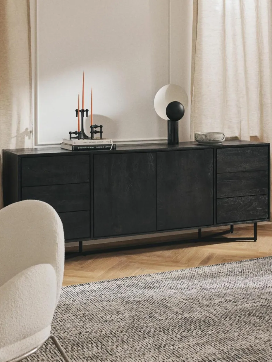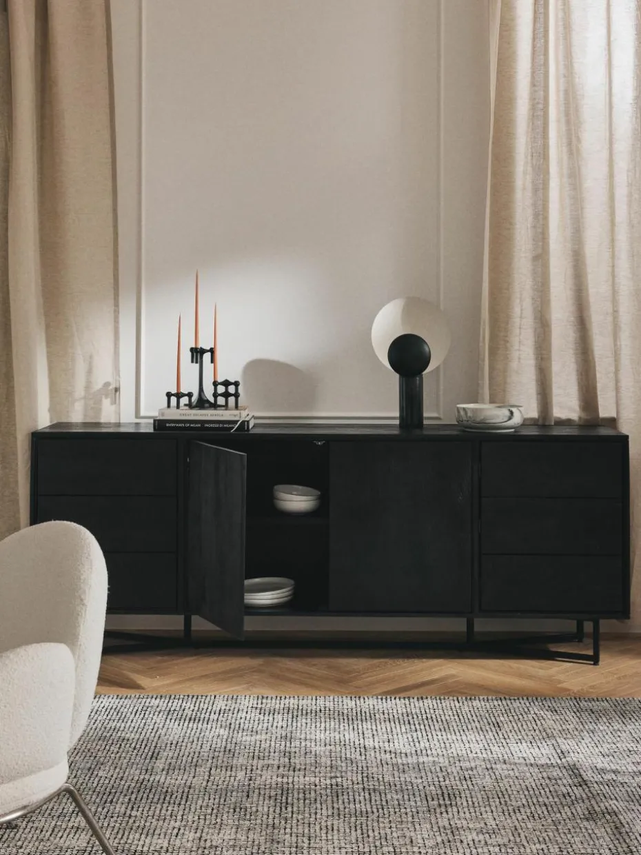 Das Sideboard verfügt über sechs Schubladen und zwei Fächer.
